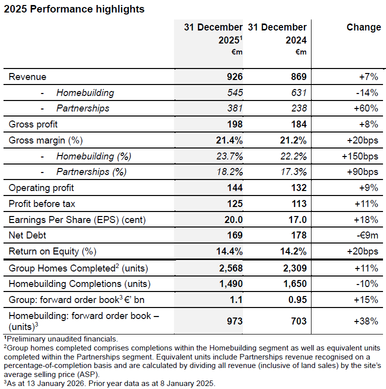 Total Group completions2 in 2026 are expected to be approximately 2,750 units, comprising over 1,600 Homebuilding units, alongside further growth in the Partnerships segment with the Group’s identified Partnerships pipeline underpinning an average annual gross profit contribution of at least €60 million for the Partnerships business.