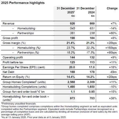 “In 2025, Glenveagh delivered on its commitments: scaling delivery and strengthening our Partnerships platform through our standardised, vertically integrated model. Our landbank, manufacturing capability and customer-first approach continue to differentiate us in a market that urgently needs scale, certainty and delivery. Our focus remains on driving sustainable growth, leveraging efficiencies across our integrated supply chain, investing in innovative precision manufacturing and design skills, and expanding our execution capability to capture long-term value for stakeholders.